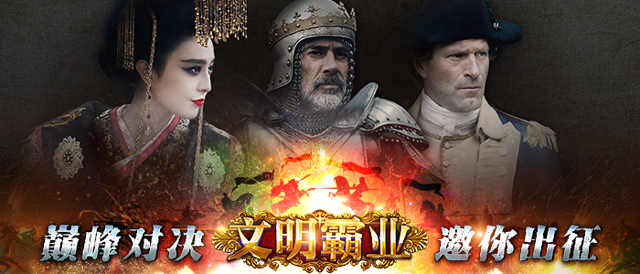 范冰冰、杰弗里·迪恩·摩根、阿伦·艾克哈特三大巨星联袂倾情代言《文明霸业》。